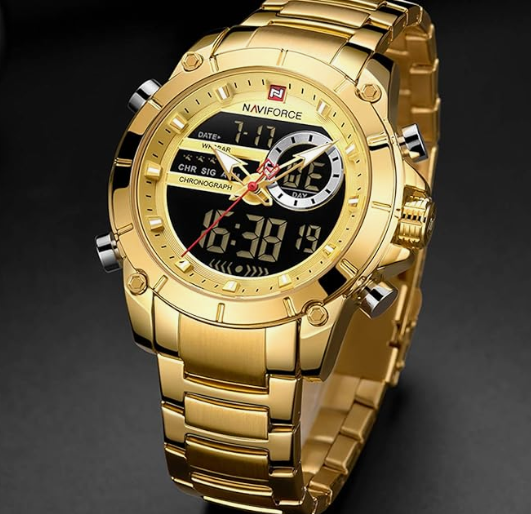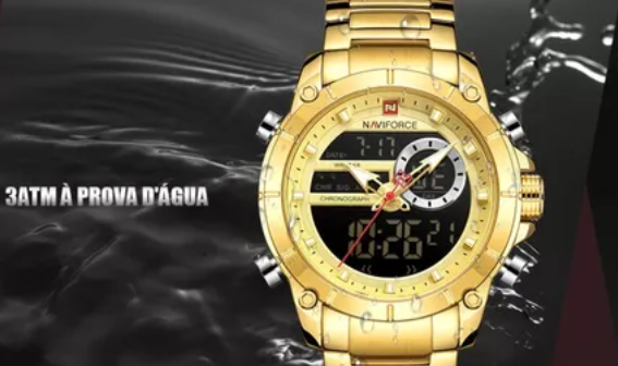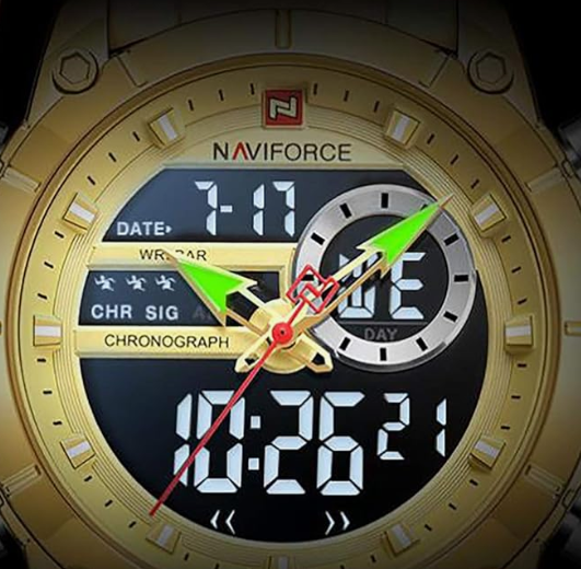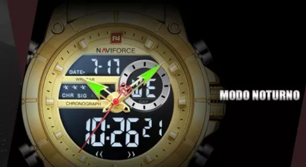 O modelo NAVIFORCE 9163 conta com um display duplo, combinando mostrador analógico e digital, permitindo fácil visualização do tempo com um toque moderno. Seu design robusto e elegante faz deste relógio uma escolha ideal para homens que desejam um acessório que alie luxo e esportividade.